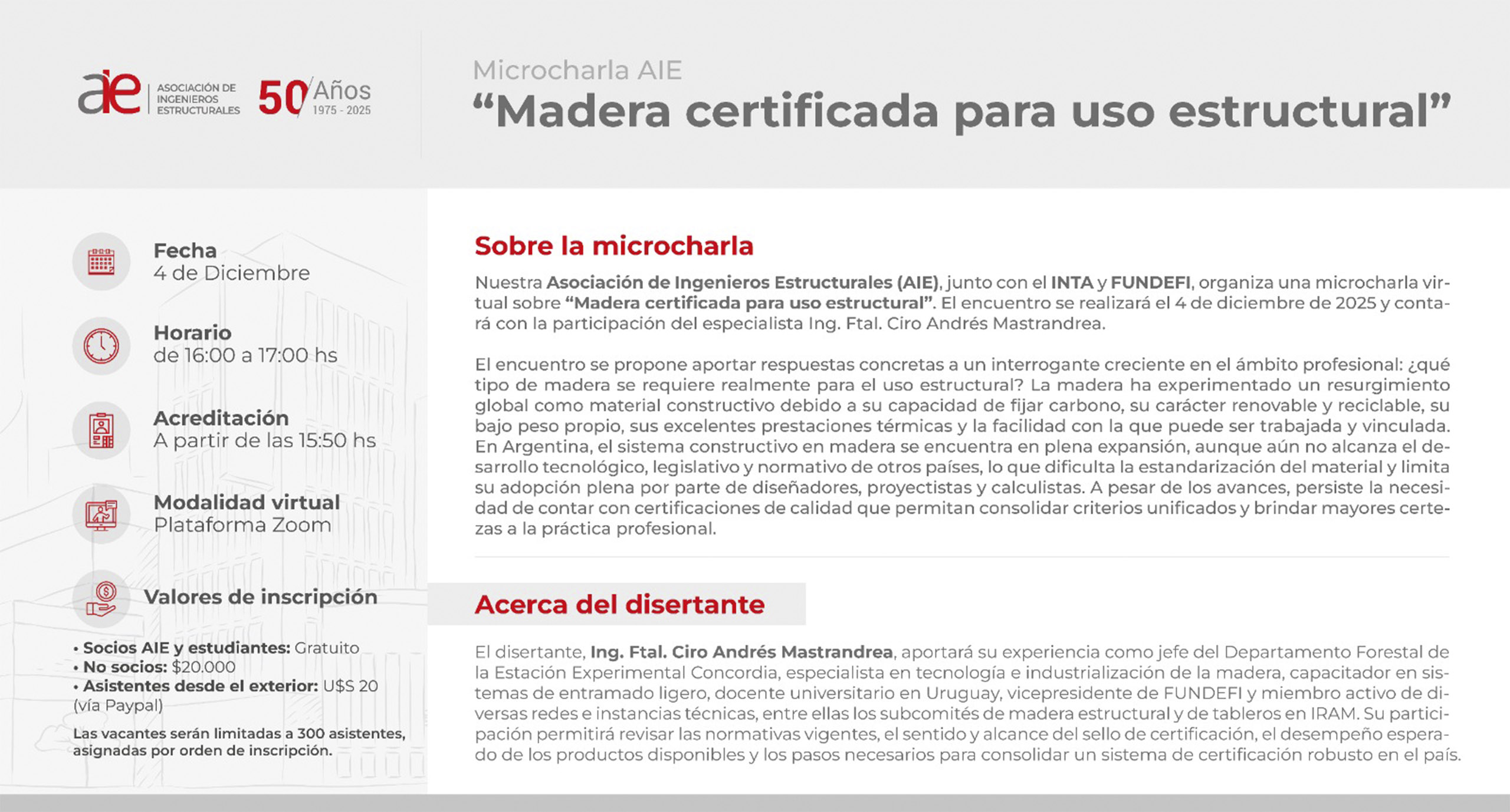 Nuestra Asociación de Ingenieros Estructurales (AIE), junto con el INTA y FUNDEFI, organiza una microcharla virtual sobre “Madera certificada para uso estructural”. El encuentro se realizará el 4 de diciembre de 2025 y contará con la participación del especialista Ing. Ftal. Ciro Andrés Mastrandrea.
