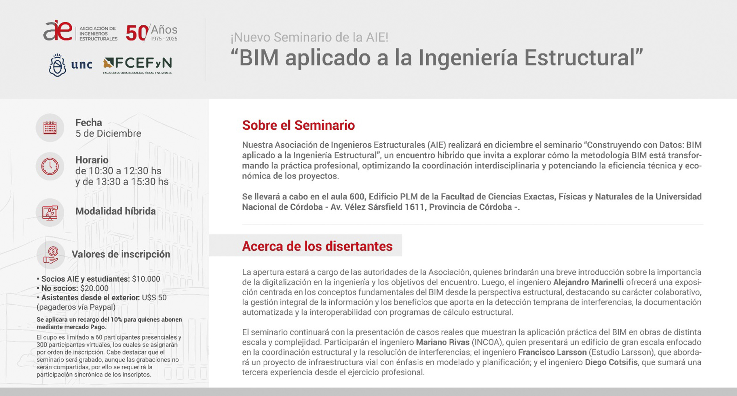 Nuestra Asociación de Ingenieros Estructurales (AIE) realizará en diciembre el seminario “Construyendo con Datos: BIM aplicado a la Ingeniería Estructural”, un encuentro híbrido que invita a explorar cómo la metodología BIM está transformando la práctica profesional, optimizando la coordinación interdisciplinaria y potenciando la eficiencia técnica y económica de los proyectos.