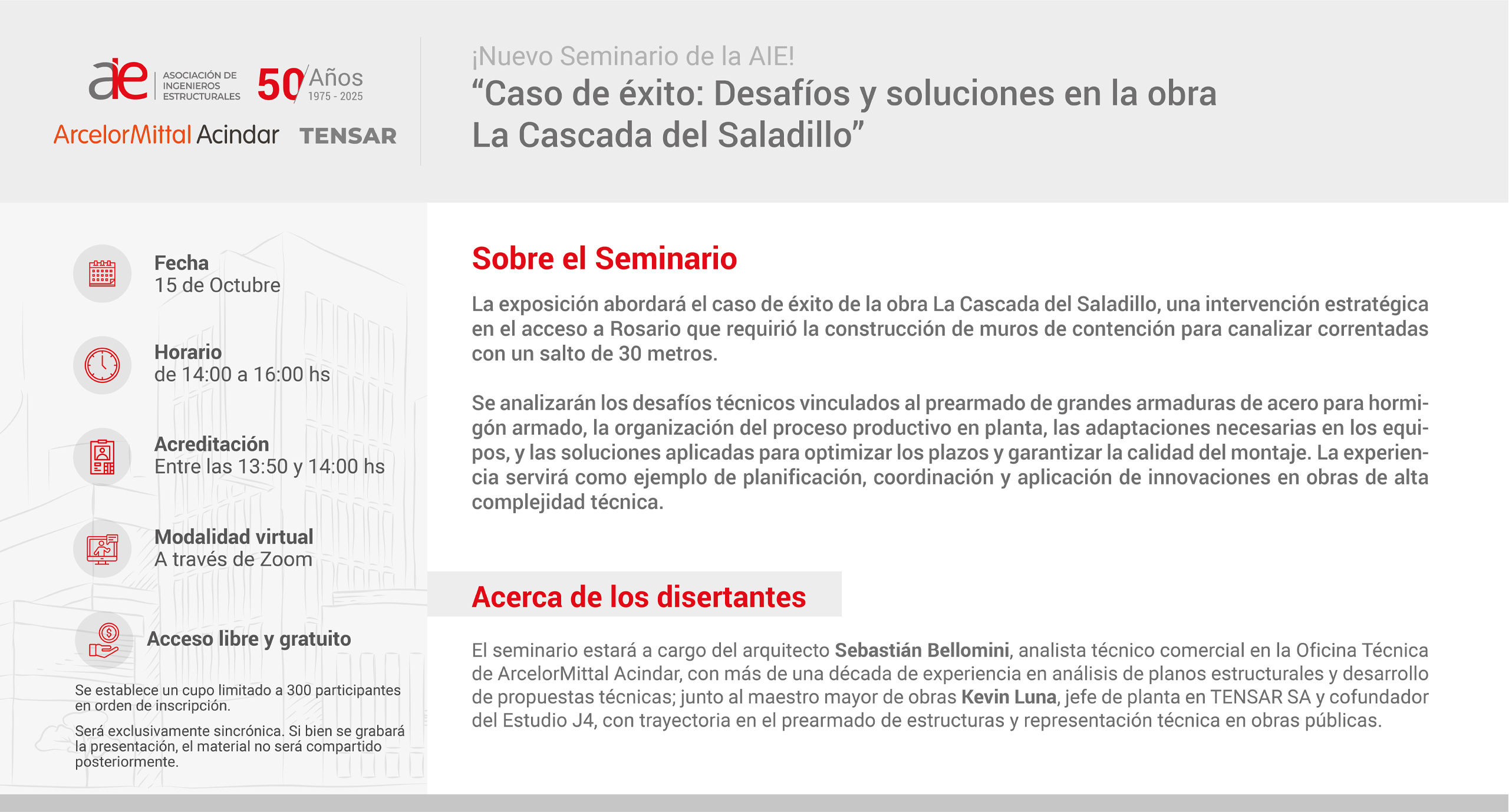 La Asociación de Ingenieros Estructurales (AIE) y Acindar Industria Argentina de Aceros SA invitan a participar del seminario virtual “Caso de éxito: Desafíos y soluciones en la obra La Cascada del Saladillo”. La misma se llevará a cabo el miércoles 15 de octubre de 2025, con acceso libre y gratuito.