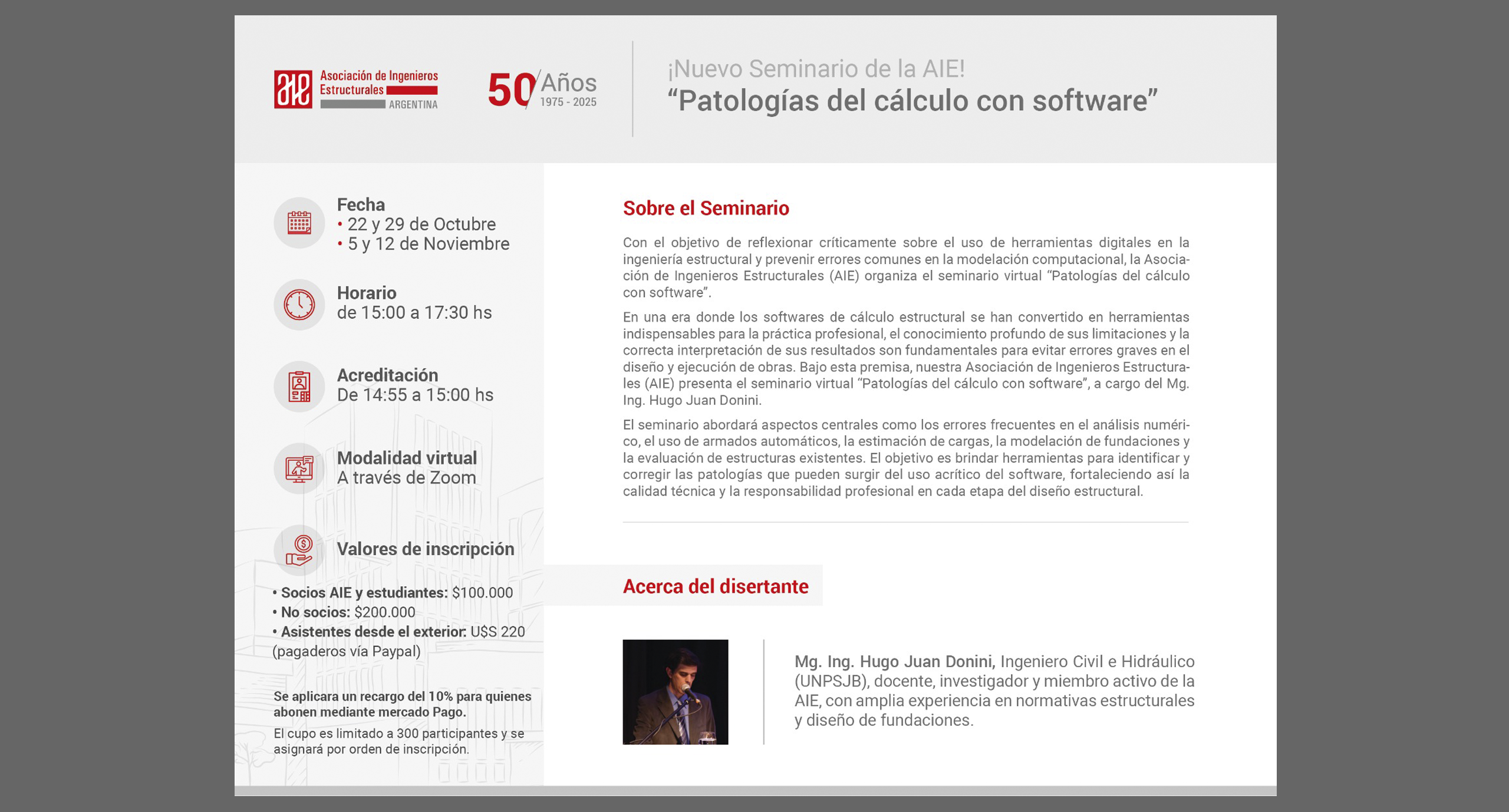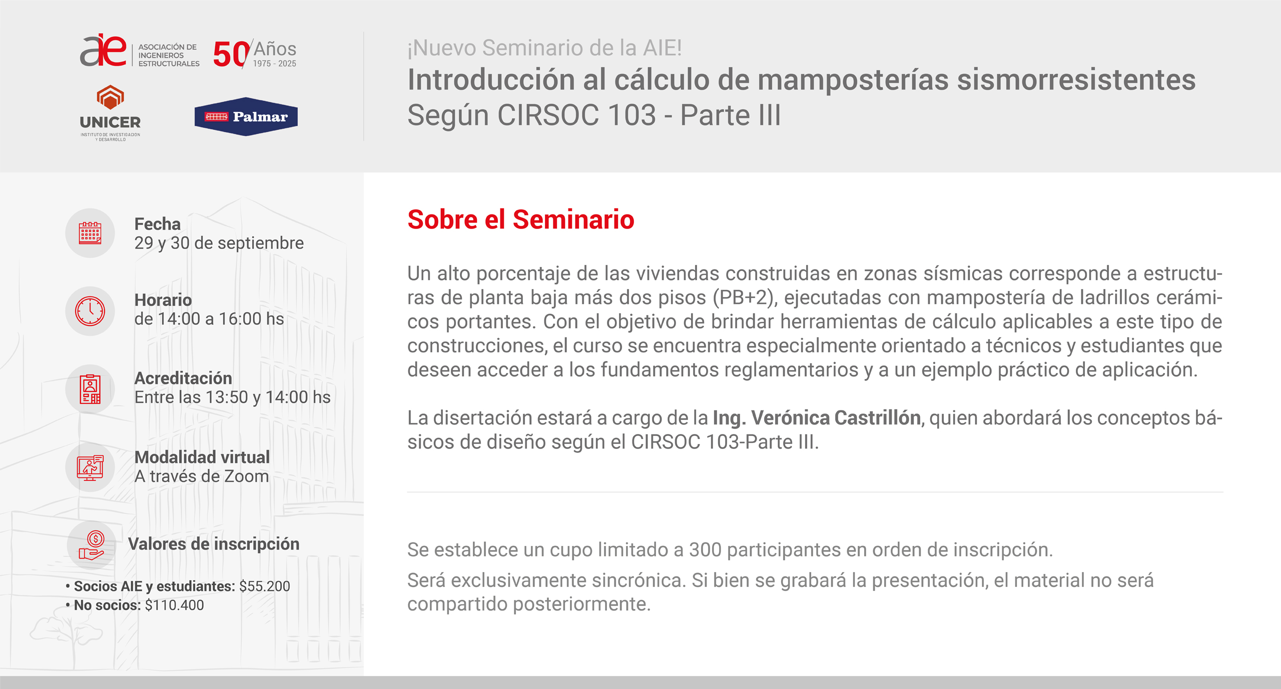 La Asociación de Ingenieros Estructurales (AIE), en conjunto con Palmar —miembro de UNICER Instituto de Investigación y Desarrollo—, invita a participar del curso “Introducción al cálculo de mamposterías sismorresistentes de acuerdo al Reglamento CIRSOC 103-Parte III (2018)”, que se dictará en modalidad virtual hoy 29 y mañana 30 de septiembre de 2025, de 14:00 a 16:00 horas, a través de la plataforma Zoom.