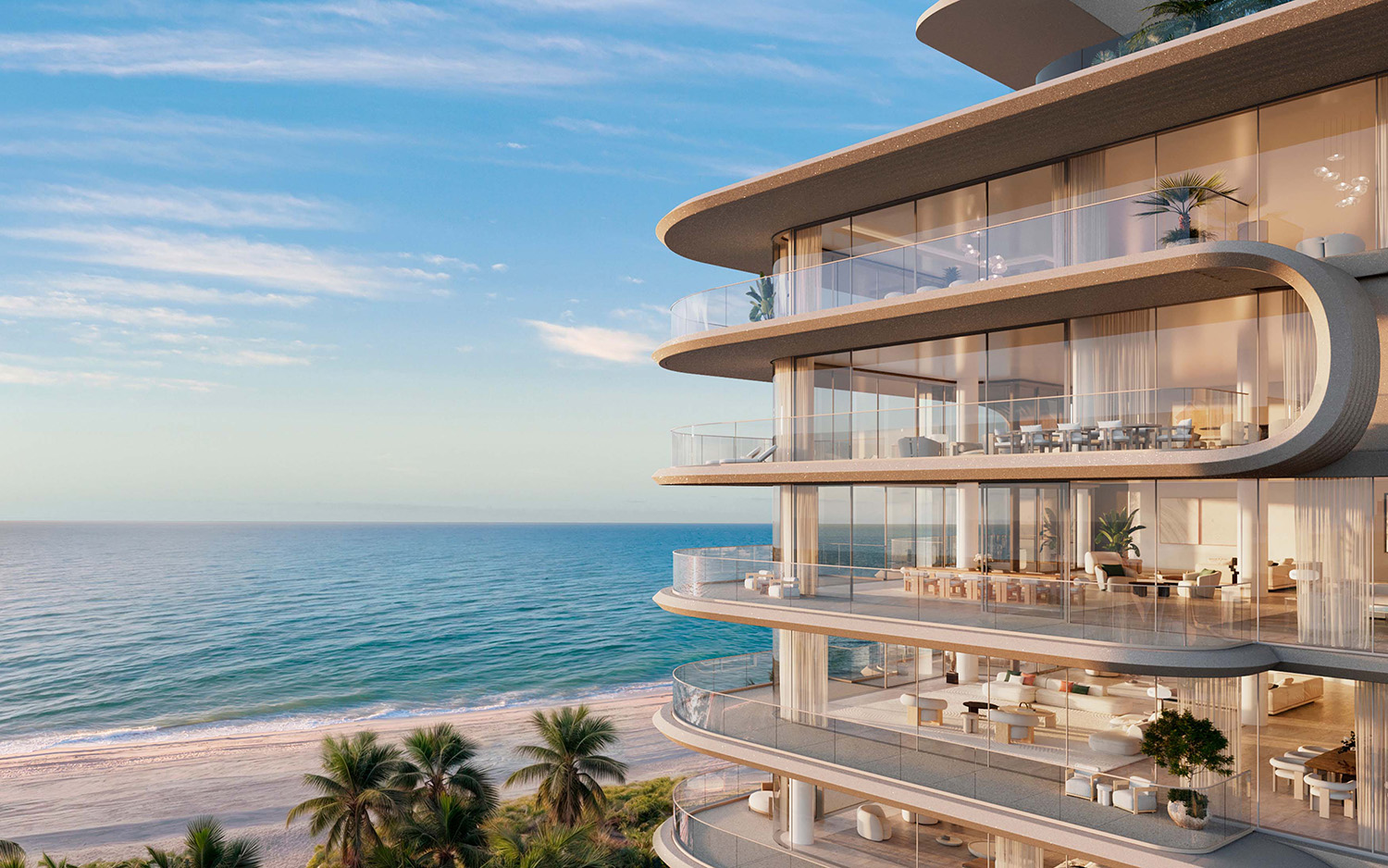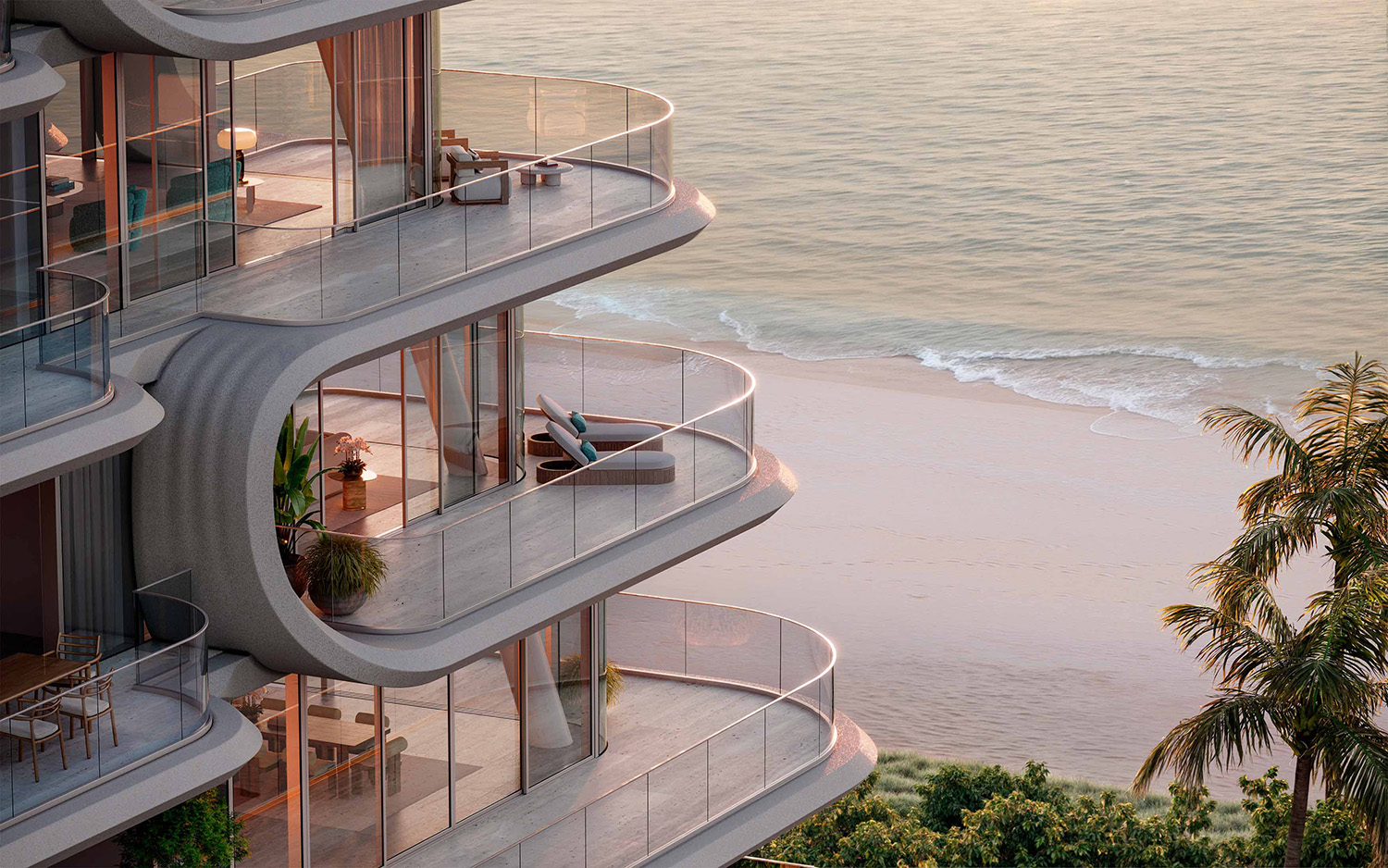 Los balcones curvilíneos, nunca alineados verticalmente para evitar la repetición, evocan el movimiento de las olas y el modelado de las dunas, integrando el volumen a su entorno costero. La materialidad de las fachadas refleja las variaciones lumínicas desde el amanecer hasta el atardecer, reforzando el vínculo con el paisaje.