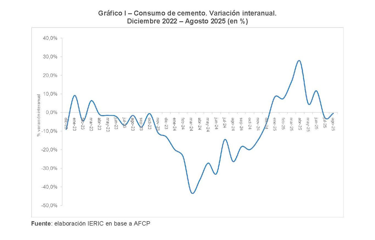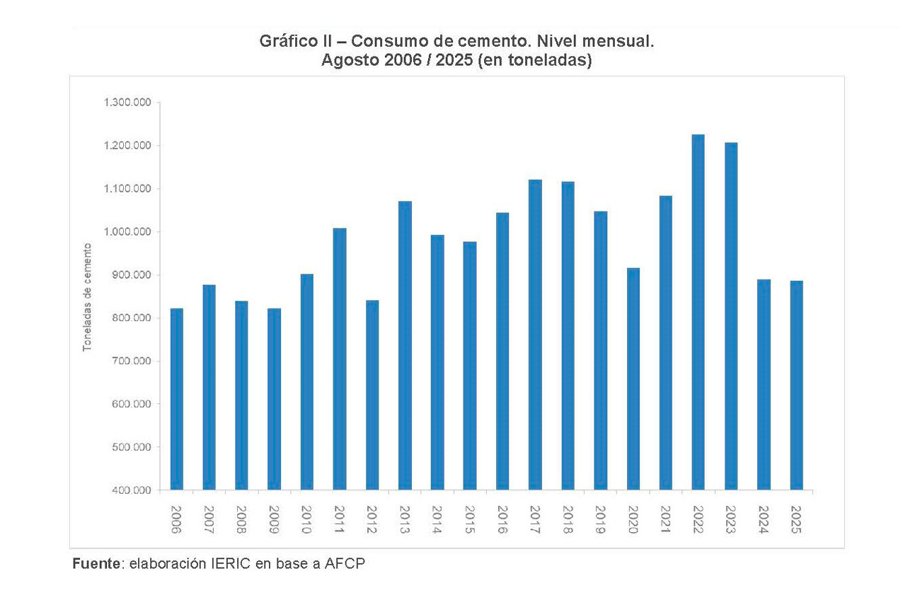 El consumo de cemento también marcó un retroceso interanual del 0,4 %, totalizando 886 mil toneladas, el segundo nivel más bajo para un mes de agosto en los últimos quince años. La contracción se explicó por la caída de los despachos en bolsa, que bajaron un 9,4 %, frente al aumento del 14,5 % de los despachos a granel.