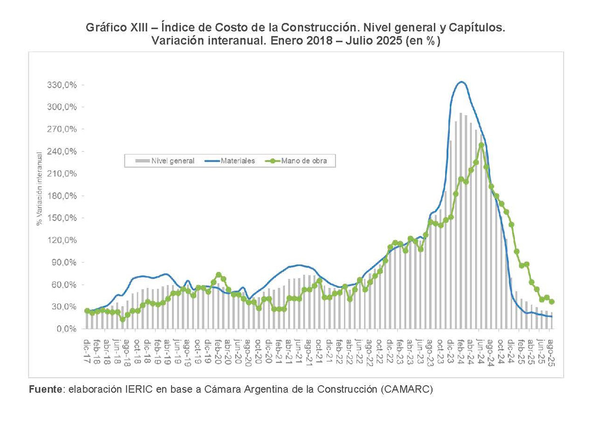 En el plano de los costos, el índice elaborado por la Cámara Argentina de la Construcción registró en agosto un alza del 1,5 % mensual, acumulando ocho meses consecutivos con variaciones por debajo del 2 %. El ajuste estuvo impulsado por el rubro materiales, que subió un 1,8 %, mientras que la mano de obra se desaceleró al 0,7 %.