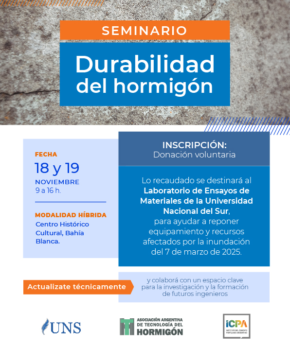El próximo martes 18 y miércoles 19 de noviembre de 2025 se llevará a cabo en el Centro Histórico Cultural de Bahía Blanca el Seminario de Durabilidad del Hormigón, un encuentro técnico de dos jornadas organizado en conjunto por la Asociación Argentina de Tecnología del Hormigón (AATH), la Universidad Nacional del Sur (UNS) y el Instituto del Cemento Portland Argentino (ICPA).