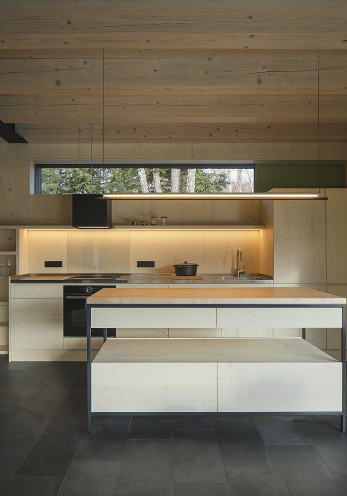 Para aprovechar las vistas panorámicas, se incorporaron grandes ventanales que enmarcan escenas únicas, desde los horizontes distantes hasta detalles cercanos como las raíces de los abedules.