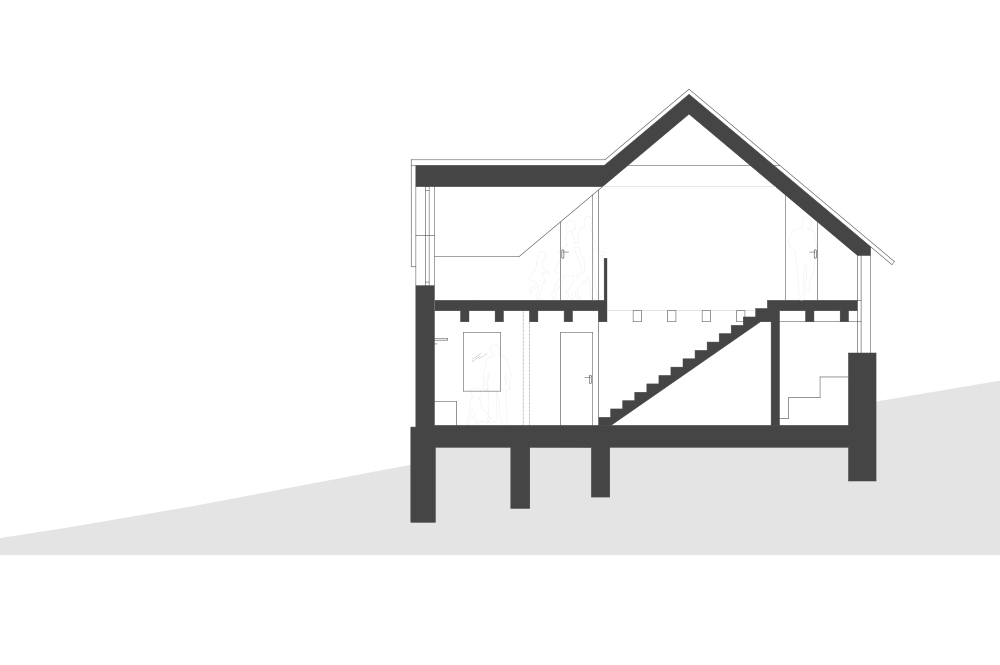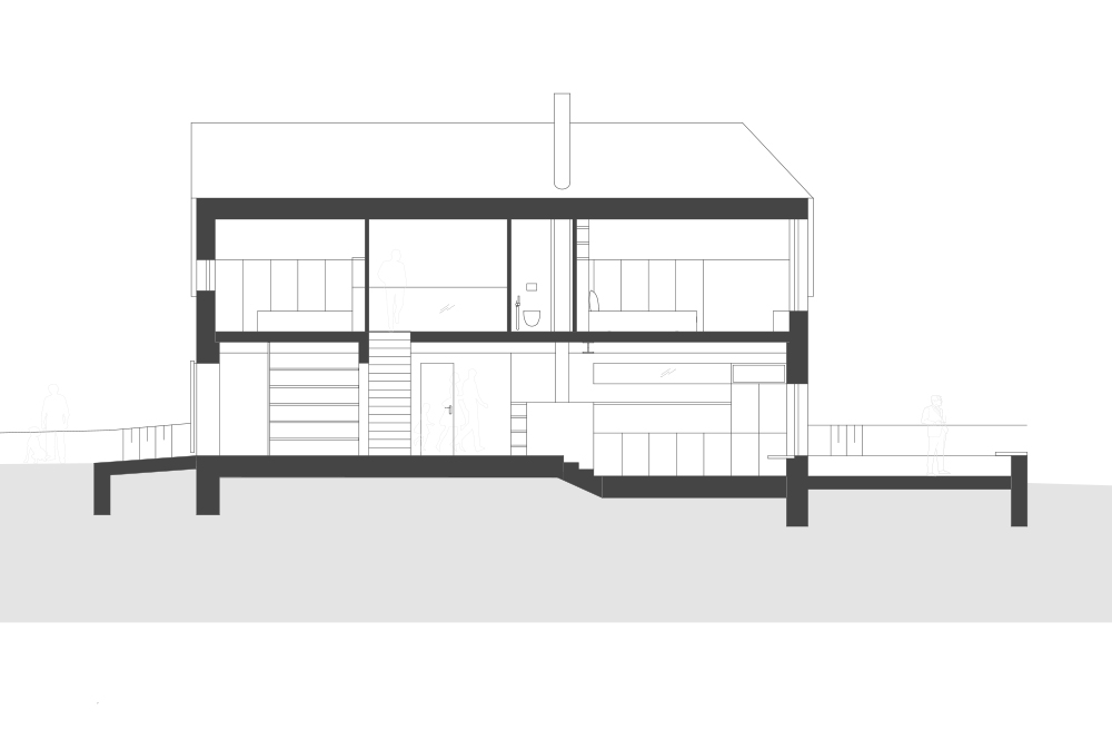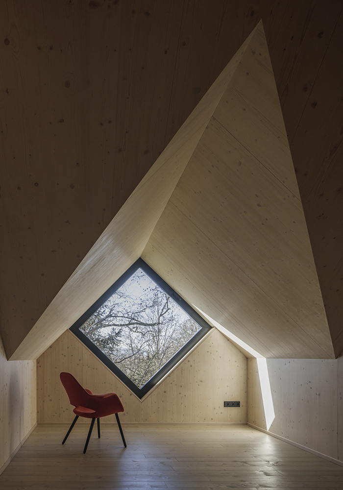 La estructura se construyó con paneles de madera del sistema Novatop, dejando visibles los tableros de abeto en las paredes interiores y el revestimiento del armazón. La fachada utiliza un revestimiento de abeto teñido en negro-marrón, mientras que el techo permanece cubierto con chapa de aluminio plegada en gris oscuro.