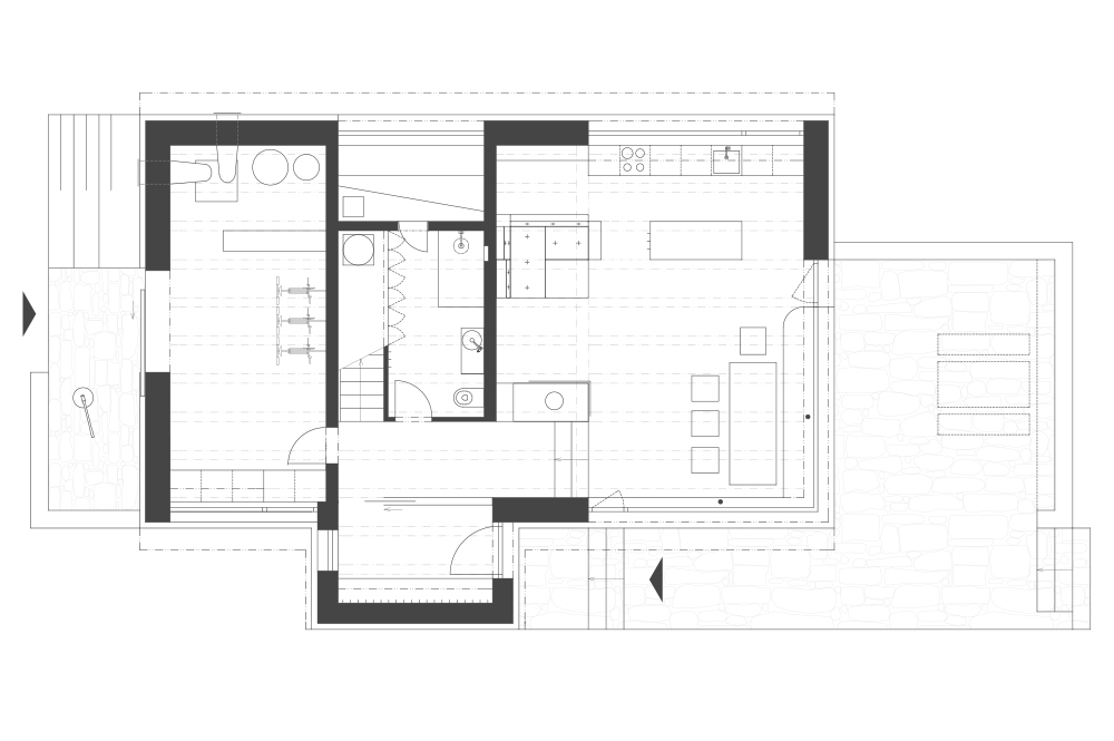 Se utilizaron materiales tradicionales que respetan la estética local, como madera teñida en tonos oscuros para la fachada y piedra reciclada para el zócalo, muros de contención y terrazas. Las aberturas de ventilación, inspiradas en las contraventanas verdes típicas de la región, complementan los ventanales sin marco, aportando un equilibrio entre tradición y modernidad.