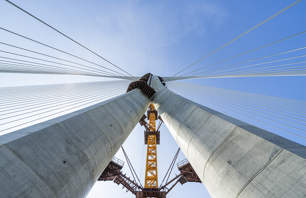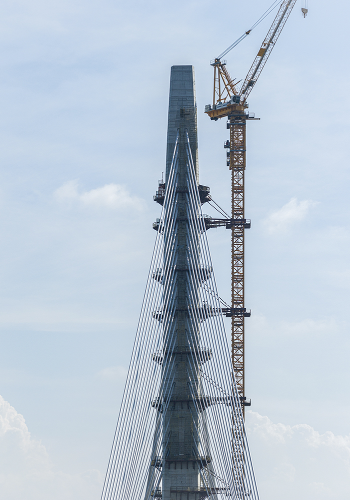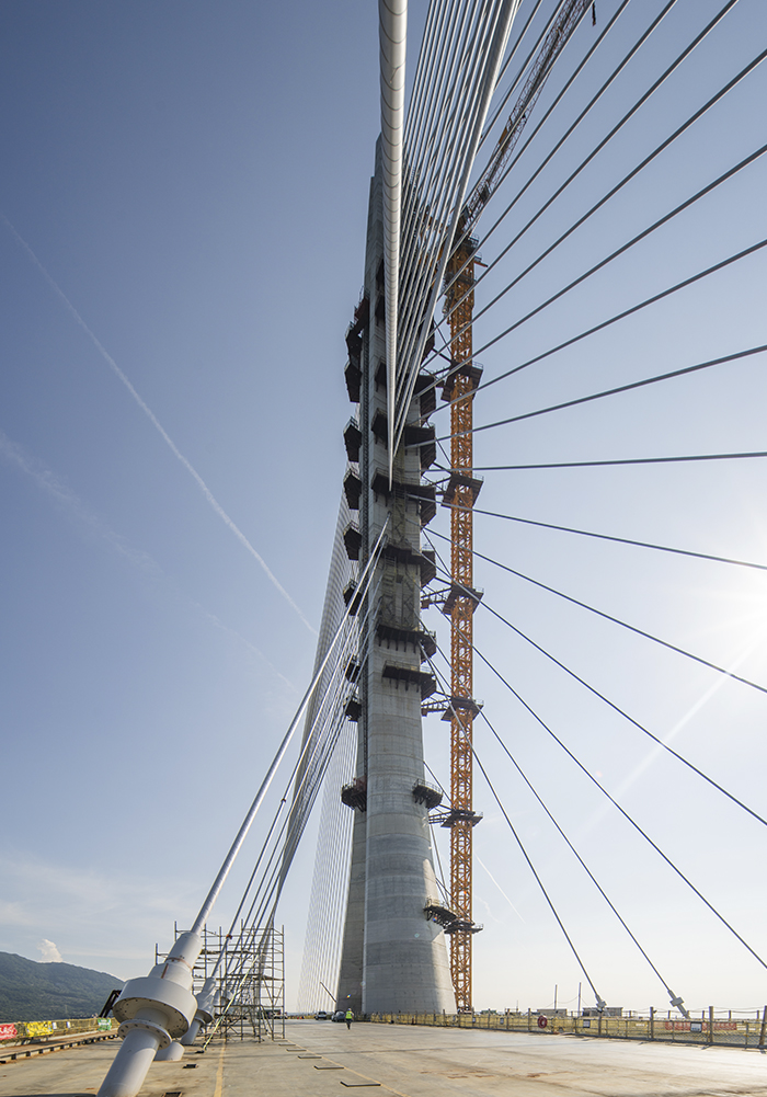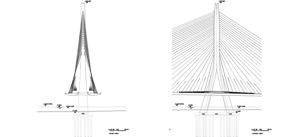 Con el objetivo de optimizar el desempeño estructural sin obstruir la visual del sol poniente, se diseñó un mástil escultórico de hormigón de 200 metros de altura, concebido para ser lo más esbelto posible, capaz de sostener con seguridad el vano central de 450 metros incluso en condiciones climáticas extremas y eventos sísmicos.
