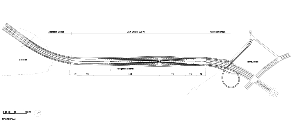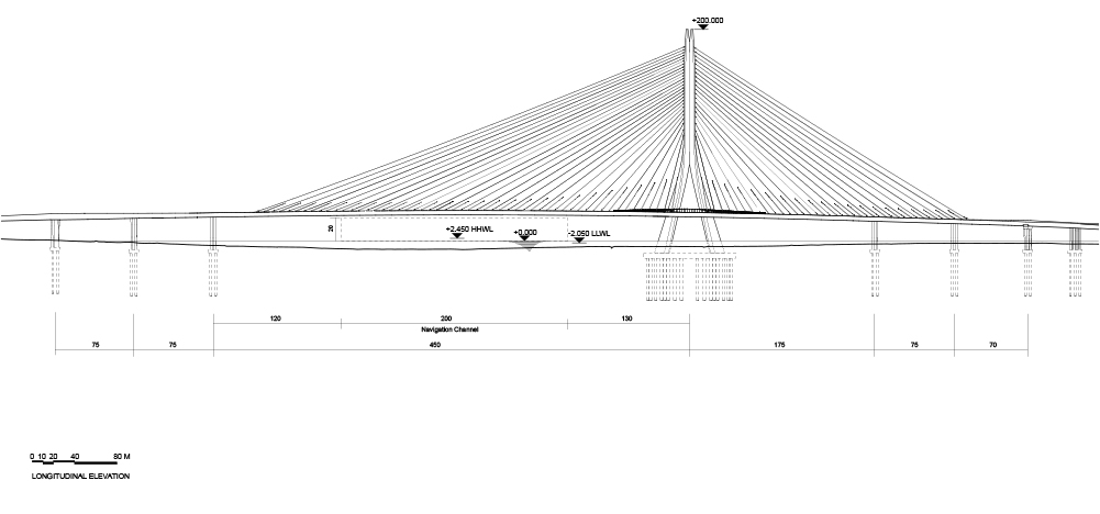 Gracias a un modelado y mapeo tridimensional detallado del estuario, se determinó la posición del mástil dentro del cauce y la altura del tablero sobre la superficie del agua para garantizar el paso seguro de embarcaciones y minimizar la interferencia con las vistas del atardecer desde los puntos panorámicos a lo largo del río. La configuración de mástil único también reduce el impacto sobre el lecho fluvial, en cumplimiento con los estrictos programas de protección ambiental del ecosistema del estuario.