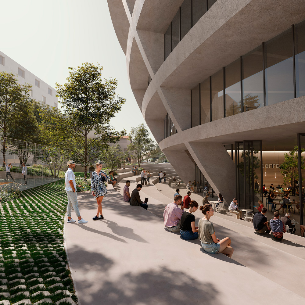La volumetría redondeada evita la existencia de “fachadas traseras” y genera una relación homogénea con el entorno. Al estrecharse hacia la base, libera espacio para plazas públicas y áreas deportivas al aire libre, mientras que su parte superior cónica crea amplias terrazas para los residentes.
