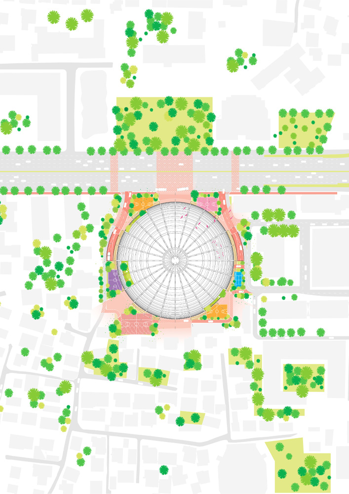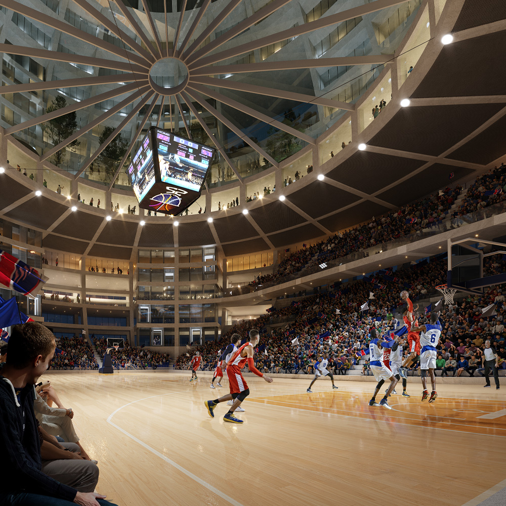 Las funciones del edificio se disponen en estratos. En el punto donde la esfera toca el suelo, se forma un nivel inferior con gradas y escalinatas que descienden hacia un anillo comercial con tiendas, cafés y servicios vinculados a los eventos deportivos. Sobre este nivel se encuentra la arena principal, accesible desde puentes peatonales, flanqueada por dos canchas de entrenamiento ocultas bajo las gradas.