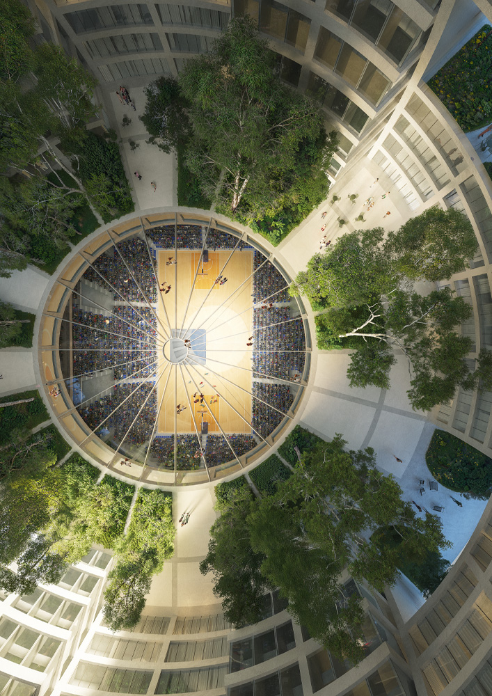 Con una forma esférica de más de 100 metros de diámetro, la propuesta combina las mencionadas funciones en un monumental espacio que fusiona deporte y comunidad en un entorno cohesivo. Llamado The Grand Ballroom, el proyecto se sumará a la colección de obras arquitectónicas distintivas de la ciudad y se convertirá en un nuevo punto de encuentro para sus habitantes.
