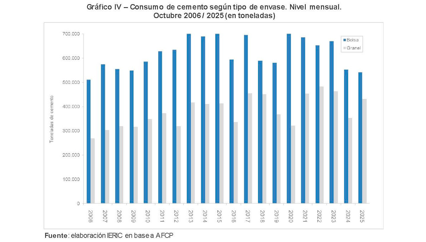 En cuanto al consumo de cemento, se observó un comportamiento más dinámico. Durante octubre, los despachos crecieron un 7,5 % interanual y alcanzaron 968.372 toneladas, el nivel mensual más alto desde noviembre de 2023. Aunque este volumen superó al registrado un año antes, continúa por debajo del promedio histórico de consumo para un mes de octubre en el período 2011–2025 y se ubicó 15,9 % por debajo del máximo histórico alcanzado en 2017.