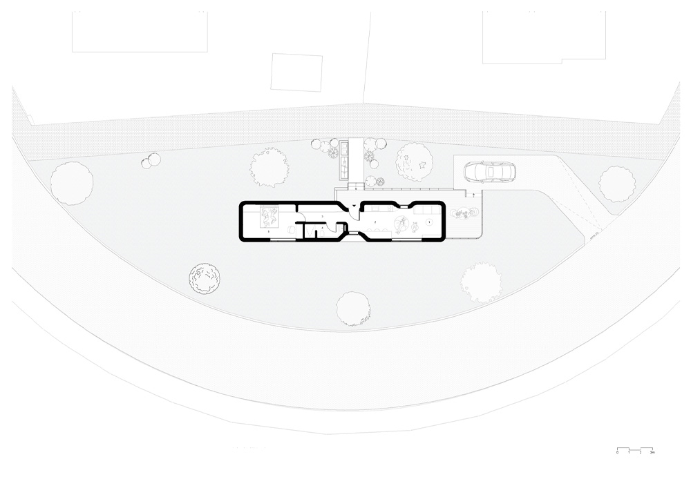 El primer prototipo se ubica en un terreno largo y estrecho al borde de una zona residencial en Niederanven. La parcela mide 3,50 metros de ancho y 17,70 metros de profundidad, con una superficie útil de apenas 47 m². El plano responde con un fuerte eje central que mantiene la perspectiva abierta de frente a fondo. Los espacios de guardado, mobiliario y servicios se alinean a ambos lados, haciendo que la casa se perciba más larga y serena de lo que sus dimensiones indican.