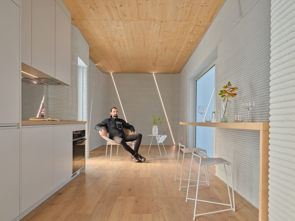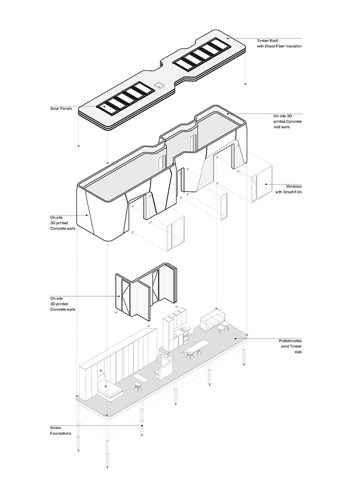 Desde el inicio, el equipo eligió la impresión 3D como método constructivo. El objetivo no era una cabaña temporal ni una caja liviana, sino una vivienda duradera y eficiente que se comportara como una casa tradicional, pero construida con rapidez y precisión.