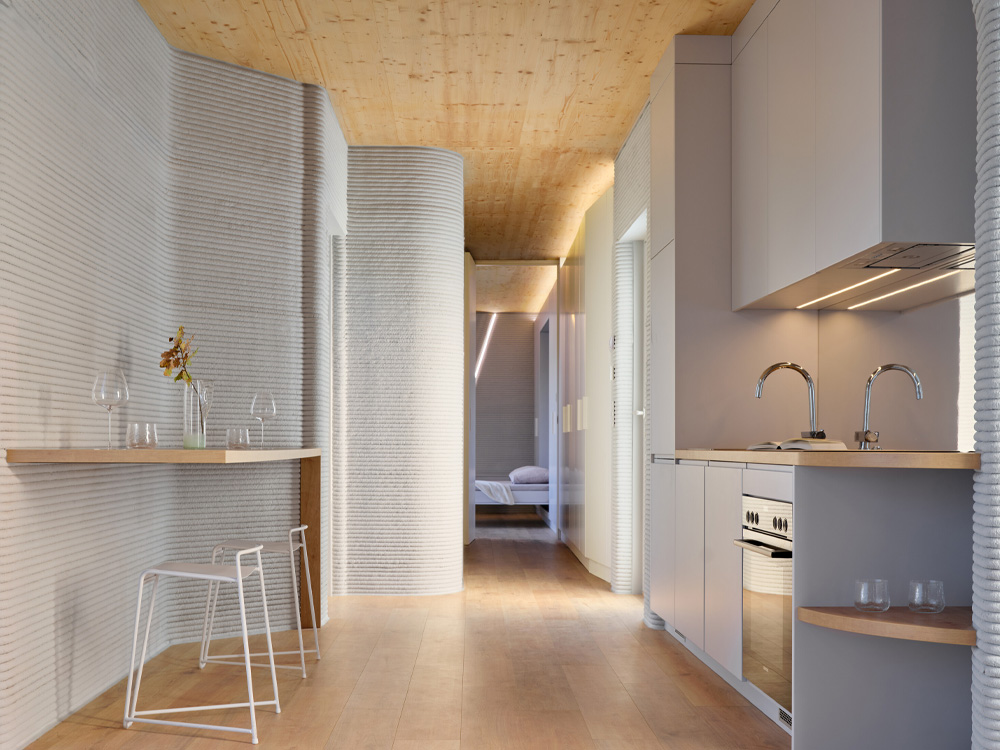 La impresión en el sitio toma aproximadamente una semana, y la obra completa, incluyendo terminaciones, se finaliza en unas cuatro semanas. La fabricación digital permite además integrar elementos técnicos durante la impresión: en este proyecto, el nicho de la ducha y la cavidad para un inodoro suspendido se imprimen como parte del muro, reduciendo tareas de corte y ajuste, y garantizando que los espacios terminados coincidan exactamente con el diseño.