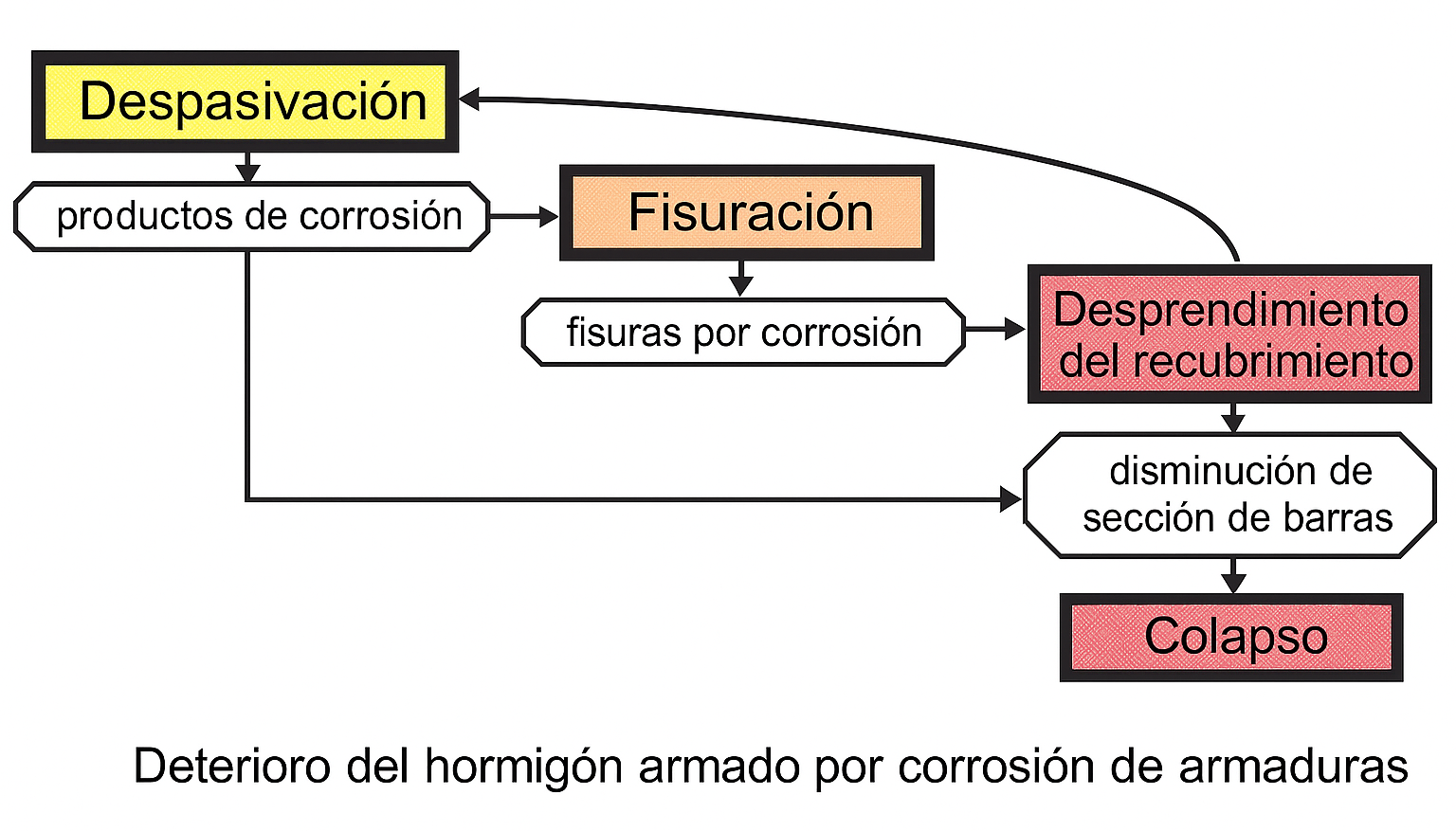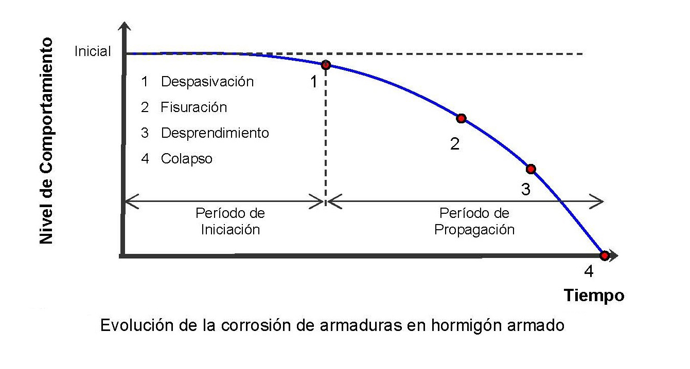 Cuando la corrosión de armaduras es el mecanismo dominante de deterioro, la evolución del daño puede describirse a partir de dos etapas bien diferenciadas. En una primera fase, denominada período de iniciación, se desarrollan las condiciones necesarias para la despasivación del acero, fundamentalmente asociadas al ingreso progresivo de cloruros hasta alcanzar una concentración crítica en la interfase acero-hormigón. La segunda etapa, conocida como período de propagación, comienza una vez iniciada la corrosión y se caracteriza por una velocidad de deterioro considerablemente mayor, que conduce a la fisuración del recubrimiento, el desprendimiento del hormigón y, eventualmente, a la pérdida de capacidad resistente.