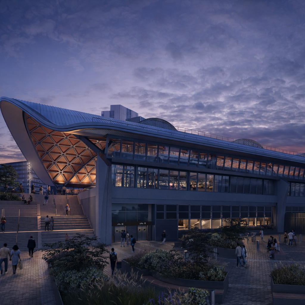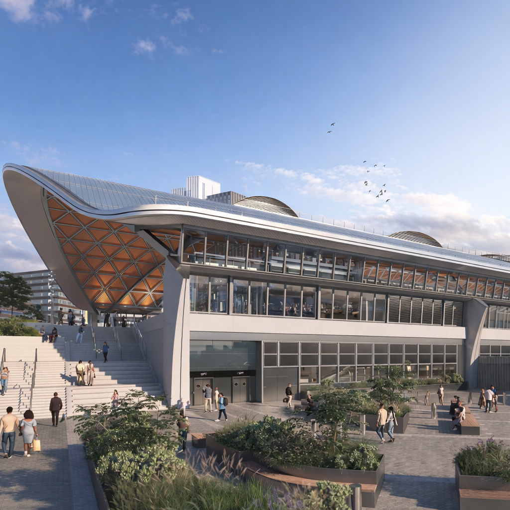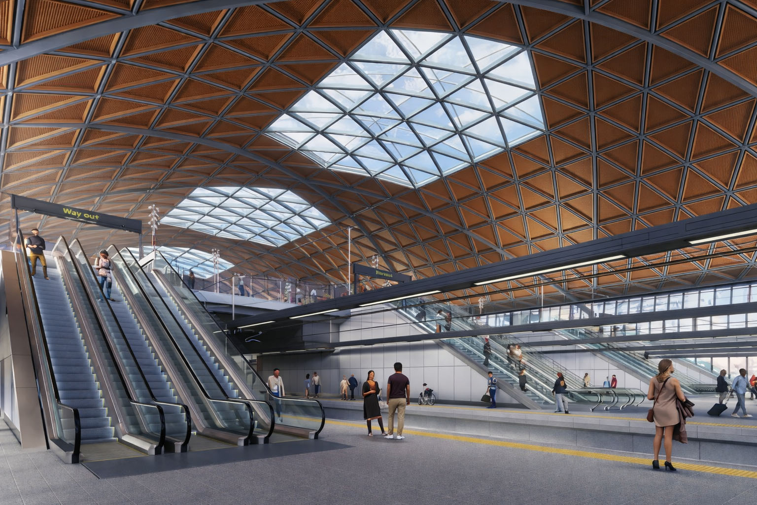 El diseño arquitectónico y estructural retoma el lenguaje de las grandes cubiertas arqueadas de las estaciones victorianas, reinterpretadas mediante tecnologías actuales. La estación contará con siete andenes cubiertos mediante una estructura de gran luz, concebida para optimizar la iluminación natural, reducir el consumo energético y garantizar un comportamiento estructural eficiente frente a cargas permanentes, variables y acciones ambientales. La resolución de la cubierta y de los grandes espacios interiores prioriza la continuidad visual, la legibilidad de recorridos y la integración entre estructura, arquitectura e instalaciones.