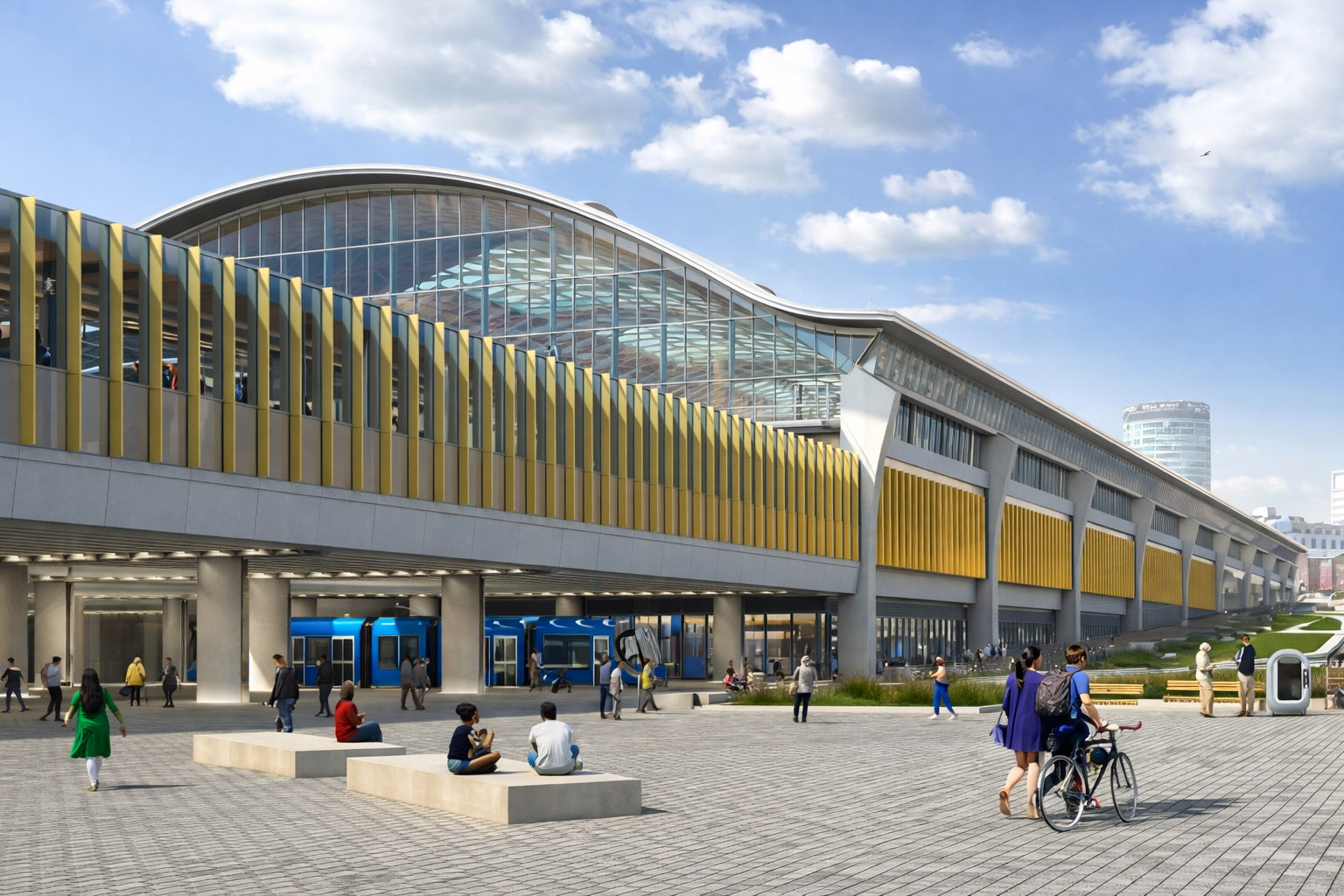 El proyecto también introduce una reorganización espacial significativa en el sector de circulación de pasajeros, permitiendo cambios de andén sin abandonar el área controlada, lo cual mejora la seguridad, la eficiencia operativa y el confort de uso. A escala urbana, la estación se articula con nuevos espacios públicos —plazas y una promenade— y con una red de accesos peatonales y ciclovías, incluyendo estacionamiento para más de 550 bicicletas, reforzando la integración entre infraestructura de transporte y tejido urbano.