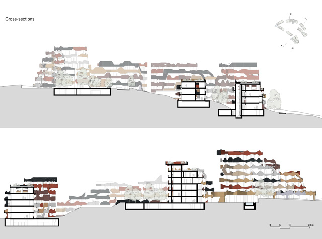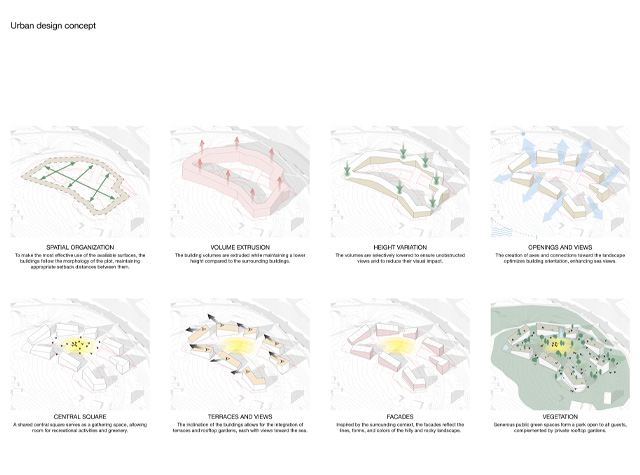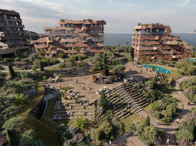 La integración con el paisaje se refuerza mediante planos de cubierta ubicados a distintas alturas, los cuales ascienden y descienden en respuesta a la topografía del sitio. Esta estrategia da lugar a un paisaje arquitectónico que se funde con su entorno natural, configurando una disposición casi anfiteatral en torno a la plaza principal. El programa funcional comprende, aproximadamente, 250 viviendas y un hotel, distribuidos en 26.000 m².