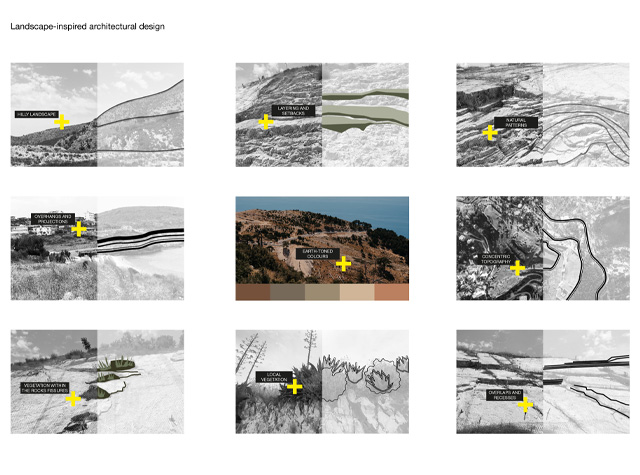 Más allá de Saranda —una ciudad que ha experimentado un fuerte auge constructivo desde la década de 1990— el paisaje se define por el diálogo entre tierra y mar, expresado a través de acantilados abruptos y pequeñas entrantes de arena. Detrás del sitio del proyecto, las losas de piedra expuestas conforman un paisaje tectónico de salientes y retranqueos. Esta identidad territorial, tensa y articulada, desempeña un papel fundamental en la concepción de la idea.