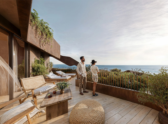 Dado el contexto costero, donde la vida al aire libre es central, cada departamento fue diseñado con un espacio abierto privado. Cada volumen edilicio, con una altura máxima de seis plantas, se va estrechando gradualmente en sus lados más cortos, generando amplias terrazas accesibles para las unidades de borde.