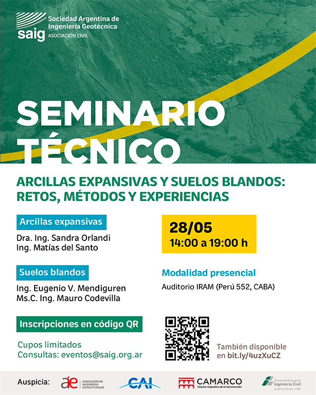La SAIG organiza el seminario “Arcillas expansivas y suelos blandos: retos, métodos y experiencias”, un espacio de actualización sobre problemáticas geotécnicas, con especialistas invitados y cupos limitados. El evento se llevará a cabo el 28 de mayo de 2026 en la ciudad de Buenos Aires.