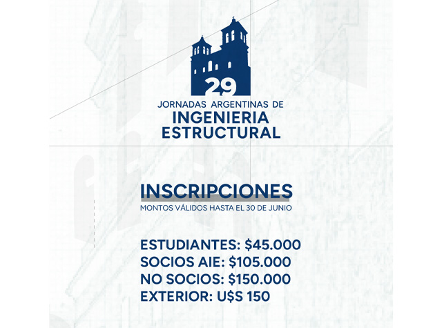 La Asociación de Ingenieros Estructurales, conjuntamente con la comisión organizadora del evento, definió los valores de inscripción para las 29º Jornadas Argentinas de Ingeniería Estructural, que se realizarán en el mes de septiembre de 2026 en la capital de la provincia de Córdoba, Argentina.