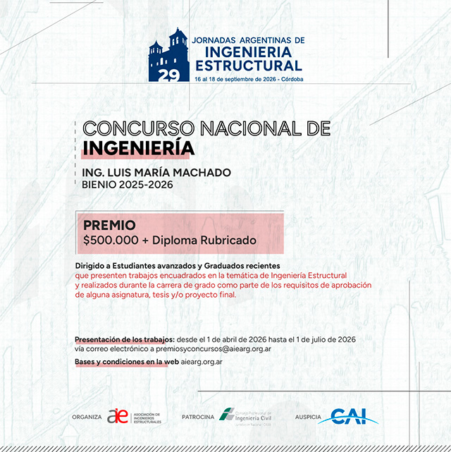 Desde la AIE se invita a estudiantes y jóvenes graduados a participar de esta convocatoria, en el marco de las 29º Jornadas Argentinas de Ingeniería Estructural 2026. El certamen fue concebido como una oportunidad para poner en valor el esfuerzo formativo, fortalecer la vocación profesional y contribuir activamente al desarrollo de la ingeniería estructural en la Argentina.