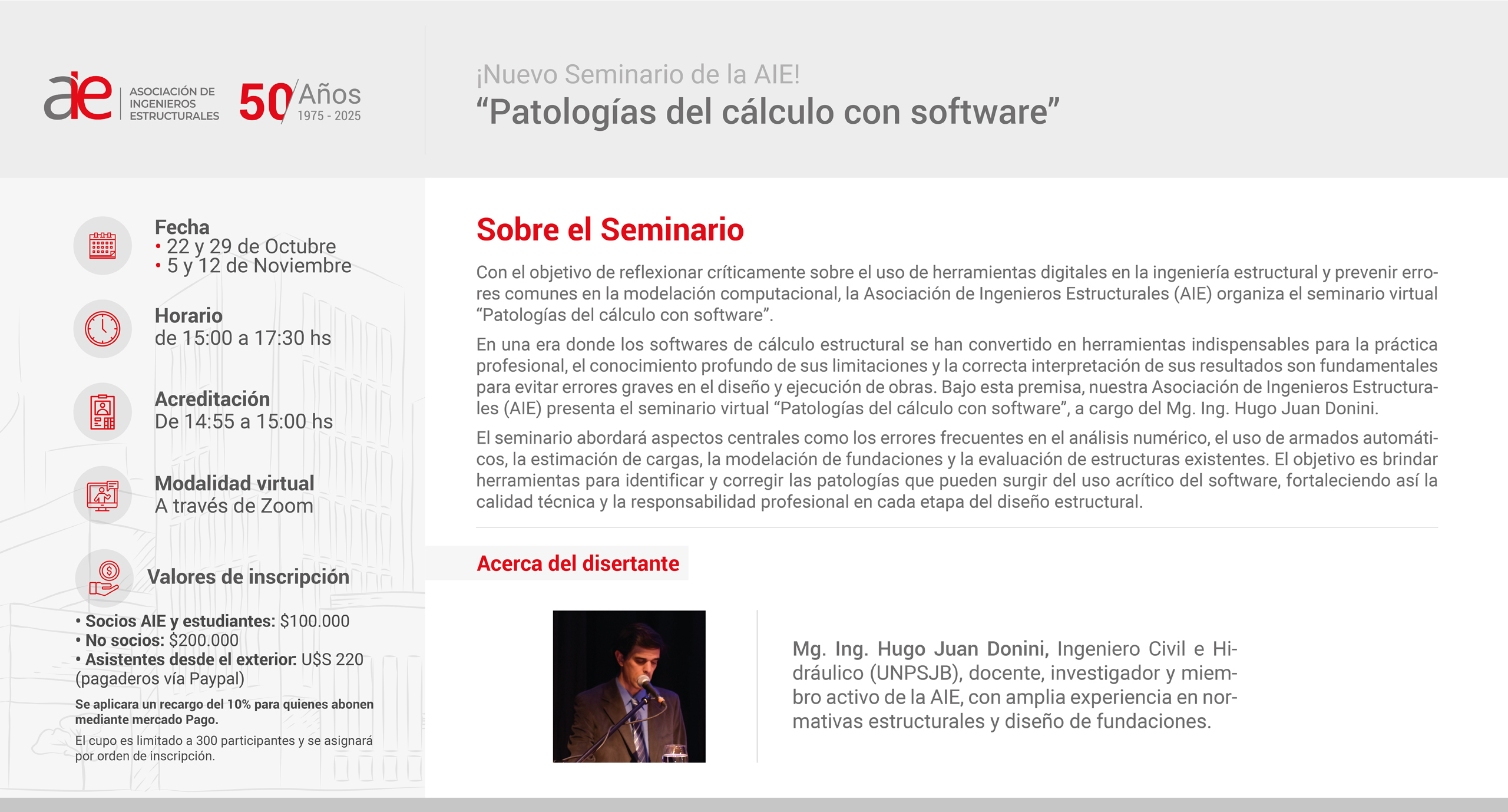 Con el objetivo de reflexionar críticamente sobre el uso de herramientas digitales en la ingeniería estructural y prevenir errores comunes en la modelación computacional, la Asociación de Ingenieros Estructurales organiza el seminario virtual titulado “Patologías del cálculo con software”.