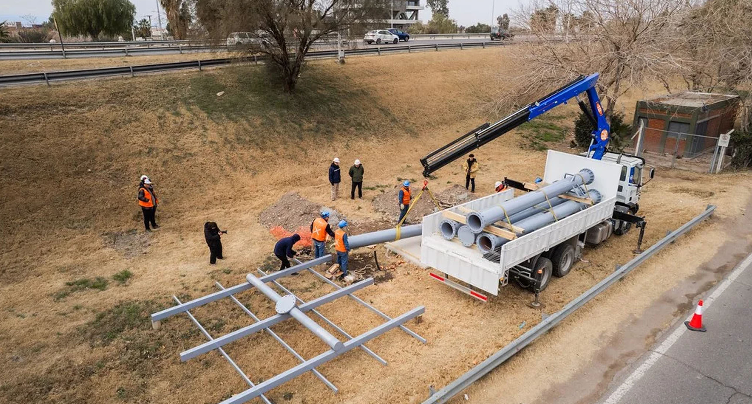 El Gobierno de San Juan avanza en la transformación de la avenida de Circunvalación en la primera ruta solar y sustentable de la Argentina. En esta etapa se ejecuta el montaje de las primeras megaestructuras metálicas que sostendrán los paneles fotovoltaicos del sistema energético.
