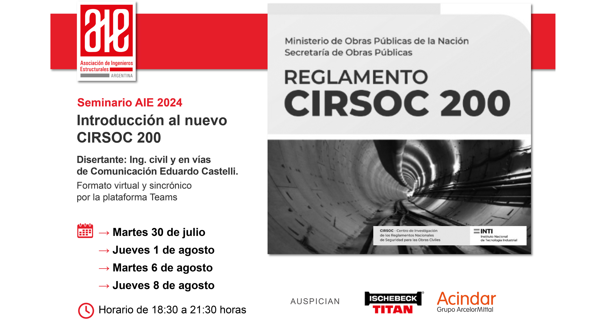 La Asociación de Ingenieros Estructurales (AIE), a través de su Comisión de Cursos, desarrolló el Seminario “Introducción al nuevo CIRSOC 200”. La modalidad de las clases fue virtual y sincrónica desde la APP Microsoft Teams.